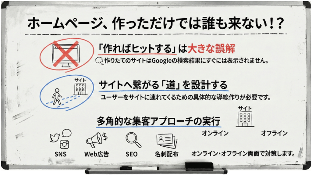 本来の姿: 「誰に、何を伝え、どうやってアクセスを集めるか」という戦略が先で、ホームページはその手段に過ぎません。